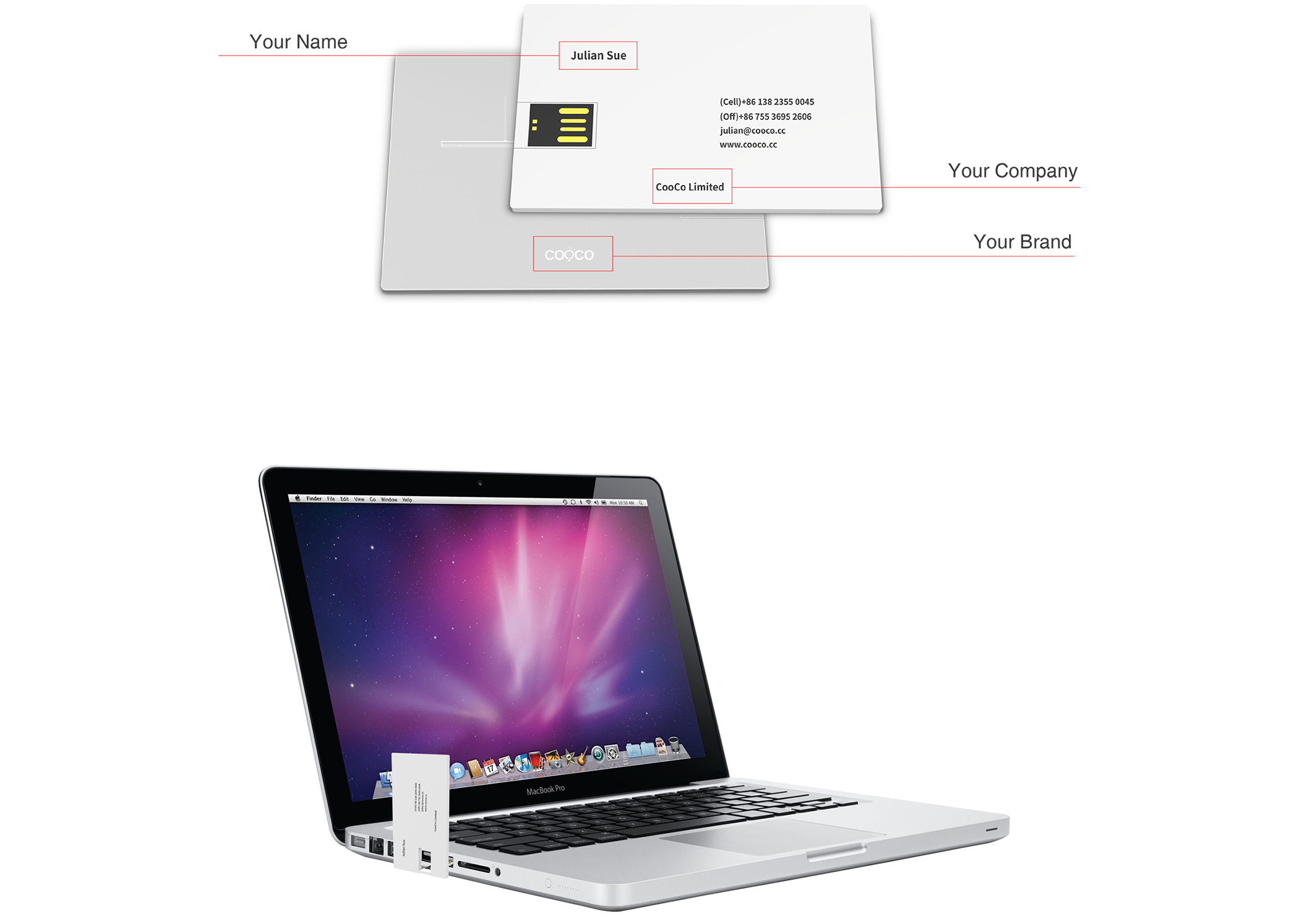 USB name card not only can be used to store relevant documents of products and solution for projects to demonstrate the details to customers at any time, but also can be name card gift to your customers printed with your own company information and logo.